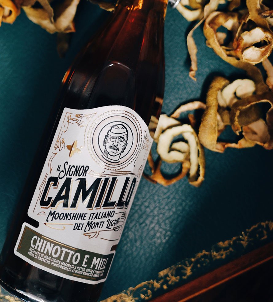 Non invecchiato e non affinato, Il Signor Camillo Chinotto e Miele è l’ultimo Moonshine nato nel 2024, che esplora il concetto di territorialità aggiungendo agli ingredienti del Classico (mais coltivato in proprio e macinato a pietra nel mulino di famiglia, acqua locale), due eccellenze locali come il chinotto di Savona e il miele di Sassello. Durante l’infusione, questi ingredienti cedono le loro tipiche nuance, conferendo al distillato un’impronta unica.